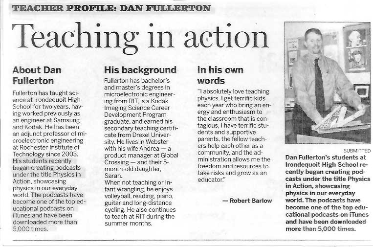 Fullerton began his professional career as a research scientist in Eastman Kodak's Research Labs, focusing on plasma processing and thin film optics, before migrating to mass microchip manufacturing in starting up Samsung Austin Semiconductor's Fab 1 in Austin, Texas. Following several years at Samsung, Fullerton returned to Eastman Kodak as a diffusion and LPCVD engineer, completing his master's degree and the Kodak two-year Image Science Career Development (ISCD) program before assuming management responsibilities as head of the Thin Films Engineering Group in Kodak's Image Sensor Solutions. In 2003, Fullerton joined the faculty of RIT's Microelectronic Engineering department, teaching the undergraduate course "Microelectronics Processing III" and the graduate course "Thin Film Processing" as an adjunct professor, including both online and on-campus sections. Following several years in Thin Films at Kodak, Fullerton accepted a promotion to head the Packaging Engineering Group at Kodak as a change of pace. By this time, however, the teaching bug had sunk in, and in 2008 Fullerton accepted a full-time position as a physics teacher at Irondequoit High School in Rochester, NY. He was named a New York State Master Physics Teacher in 2014.