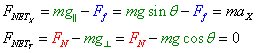 Using these equations, we can re-draw the free body diagram, replacing mg with its components. Now all the forces line up with the axes, making it straightforward to write Newton's 2nd Law Equations (FNETx and FNETy) and continue with our standard problem-solving strategy.