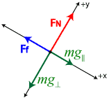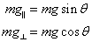 Unfortunately, the force of gravity on the box, mg, doesn't lie along one of the axes. Therefore, it must be broken up into components which do lie along the x- and y-axes in order to simplify our mathematical analysis. To do this, we can use geometry to break the weight down into a component parallel with the axis of motion (mg║) and a component perpendicular to the x-axis (mg┴) using the equations: