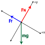 Once the forces acting on the box have been identified, we must be clever about our choice of x-axis and y-axis directions. Much like we did when analyzing free falling objects and projectiles, if we set the positive x-axis in the direction of initial motion (or the direction the object wants to move if it is not currently moving), the y-axis must lie perpendicular to the ramp's surface (parallel to the normal force). Let's re-draw our free body diagram, this time superimposing it on our new axes.
