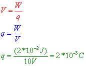 V in this formula is potential difference (in volts), W is work or electrical energy (in Joules), and q is your charge (in Coulombs). Let's take a look at a sample problem.