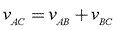 In dealing with these situations, you can state the velocity of an object with respect to its reference frame. For example, the velocity of object A with respect to reference frame C would be written as vAC. Even if you don’t know the velocity of object A with respect to C directly, by finding the velocity of object A with respect to some intermediate object B, and the velocity of object B with respect to C, you can combine your velocities using vector addition to obtain: