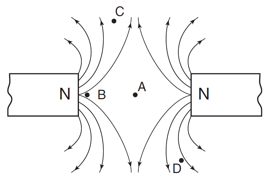 Question: The diagram below shows the lines of magnetic force between two north magnetic poles. At which point is the magnetic field strength greatest?