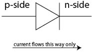 As you can see from the diode's I-V curve, the diode acts like a one-way gate for current, allowing current to flow through in one direction only (from p to n). For this reason, the circuit symbol for a diode indicates the direction current can flow from p to n with an arrow, and shows a line blocking current from n to p.