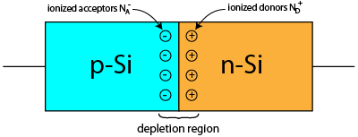 Because the free charges near the junction have crossed the junction and been absorbed by the dopant atoms, there is a deficiency of free charges near the junction. This region is known as the depletion region, because it is depleted of free carriers. You may also hear it referred to as the space charge region, because it is a region of positive donor charges and negative acceptor charges separated by space.