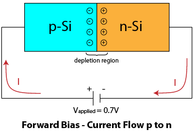 When a potential difference of approximately 0.7 volts or greater is applied to the circuit, however, with the positive side of the applied voltage connected to the p-side of the diode, the applied voltage counteracts the built-in field in the depletion region, and charge carriers can again flow across the junction by diffusion, allowing positive current flow from the p-side to the n-side of the diode. This is known as applying a forward bias to the diode.