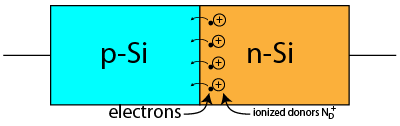 Free electrons on the n-side of the junction diffuse across the junction into the p-side, leaving behind positively ionized donor atoms (ND+) as they slide into the vacancies that were previously holes. This means the electrons have disappeared in the p-type silicon and leaves the n-type silicon region close to the junction with a net positive charge.