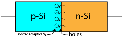 In similar fashion, holes on the p-side of the junction diffuse across the junction into the n-side, leaving behind negatively ionized acceptor atoms (NA-) The region close to the junction in the p-type silicon picks up a net negative charge. The holes disappear in the n-type silicon because of all the free electrons.