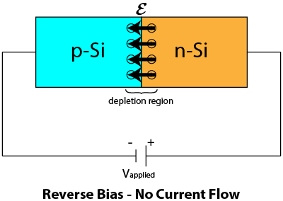 If a potential difference (voltage) is applied in the opposite direction, however, with the positive side of the applied voltage attached to the n-side of the diode, the applied voltage enhances the built-in field in the diode, preventing current flow and making the diode an even better insulator. This is known as applying a reverse bias to the diode.