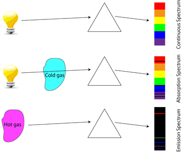 If a gas-discharge lamp is made from mercury vapor, the mercury vapor is made to emit light by application of a high electrical potential. The light emitted by the mercury vapor is created by electrons in higher energy states falling to lower energy states, therefore the photons emitted correspond directly in wavelength to the difference in energy levels of the electrons. This creates a unique spectrum of frequencies which can be observed by separating the colors using a prism, known as an emission spectrum. By analyzing the emission spectra of various objects, scientists can determine the composition of those objects.