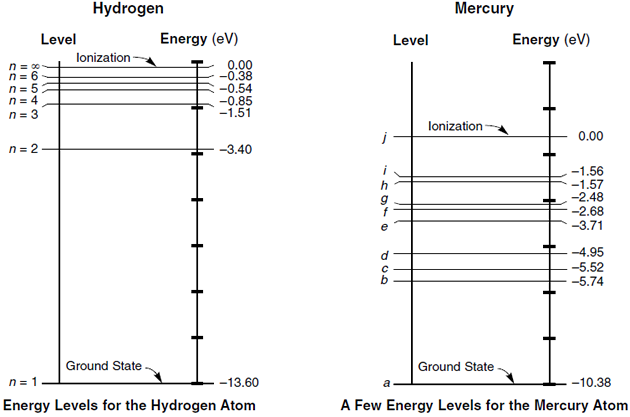 A useful tool for visualizing the allowed energy levels in an atom is the energy level diagram. Two of these diagrams (one for hydrogen and one for mercury) are provided for you below. In each of these diagrams, the n=1 energy state is the lowest possible energy for an electron of that atom, known as the ground state. The energy corresponding to n=1 is shown on the right side of the diagram in electron-volts. So, for hydrogen, the ground state is a level of -13.6 eV.
