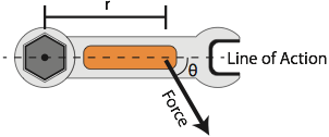 Let’s take a look at the example of a wrench turning a bolt. A force is applied at a distance from the axis of rotation. Call this distance r. When you apply forces at 90 degrees to the imaginary line leading from the axis of rotation to the point where the force is applied (known as the line of action), you obtain maximum torque. As the angle at which the force applied decreases (θ), so does the torque causing the bolt to turn. Therefore, you can calculate the torque applied as: