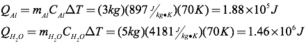 Question: A three-kilogram aluminum pot is filled with five kilograms of water. How much heat is absorbed by the pot and water when both are heated from 25°C to 95°C?