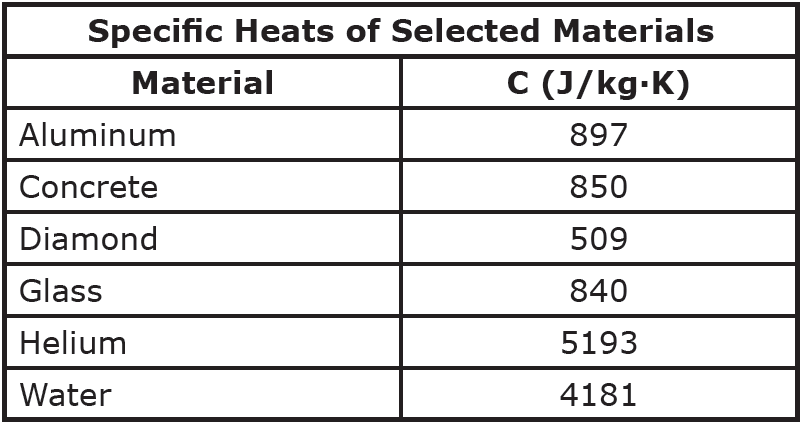 When heat flows into or out of an object, the amount of temperature change depends on the material. The amount of heat required to change one kilogram of a material by one degree Celsius (or one Kelvin) is known as the material’s specific heat (or specific heat capacity), represented by the symbol C.