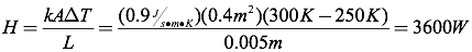Question: Find the rate of heat transfer through a 5 mm thick glass window with a cross-sectional area of 0.4 m2 if the inside temperature is 300K and the outside temperature is 250K.