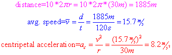 Question: Miranda drives her car clockwise around a circular track of radius 30m. She completes 10 laps around the track in 2 minutes. Find Miranda's total distance traveled, average speed, and centripetal acceleration.