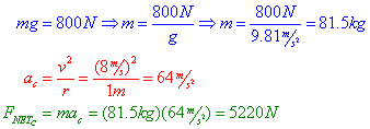 Answer: Given mg=800N, r=1m, v=8m/s; Find m, ac, Fc