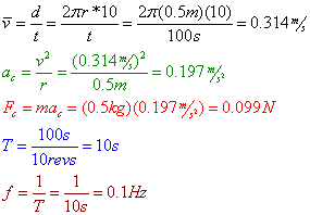 Question: A 500g toy train completes 10 laps of its circular track in 1 min 40s. If the diameter of the track is 1m, find the train's centripetal acceleration (ac), centripetal force (Fc), period (T), and frequency (f).