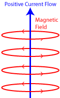 To determine the direction of the electrically-induced magnetic field, use the "right-hand-rule" by pointing your right-hand thumb in the direction of positive current flow. The curve of your fingers then shows the direction of the magnetic field around the wire.