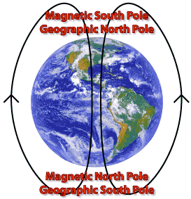 Much like electrical charges, like poles exert a repelling force on each other, while opposite poles exert an attractive force on each other. Because the Earth exerts a force on magnets (which, when used to tell direction, we call a compass), we can conclude that the Earth is a giant magnet. If the north pole of a magnet is attracted to the geographic north pole of the Earth, and opposite poles attract, then it stands to reason that the geographic north pole of the Earth is actually a magnetic south pole! Compasses always line up with the net magnetic field.